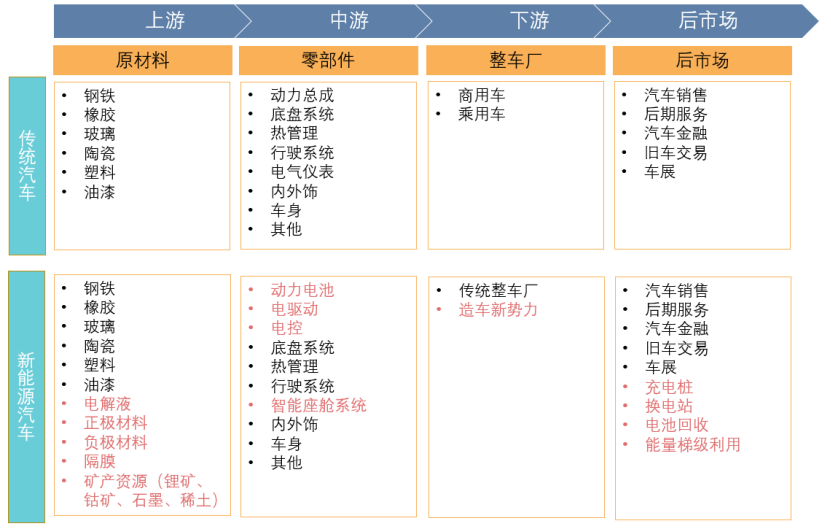 ?2、產(chǎn)業(yè)鏈中游零部件方面的不同主要是動(dòng)力總成,以及智能座艙系統(tǒng);產(chǎn)業(yè)鏈下游主要是新能源汽車領(lǐng)域出現(xiàn)了造車新勢力;