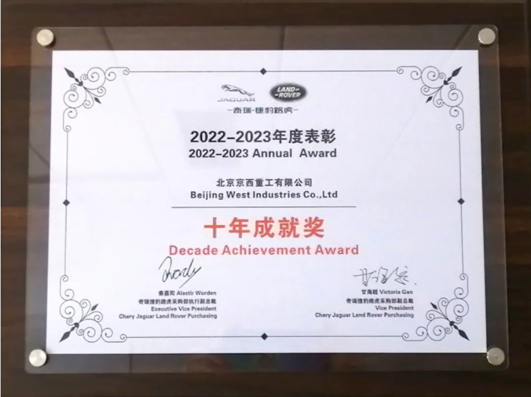 榮獲奇瑞捷豹路虎2022-2023年度表彰——十年成就獎,該榮譽不僅是對十年合作豐碩成果的表彰,更代表客戶對于京西集團在不懈創(chuàng)新和推進(jìn)行業(yè)發(fā)展的認(rèn)可。