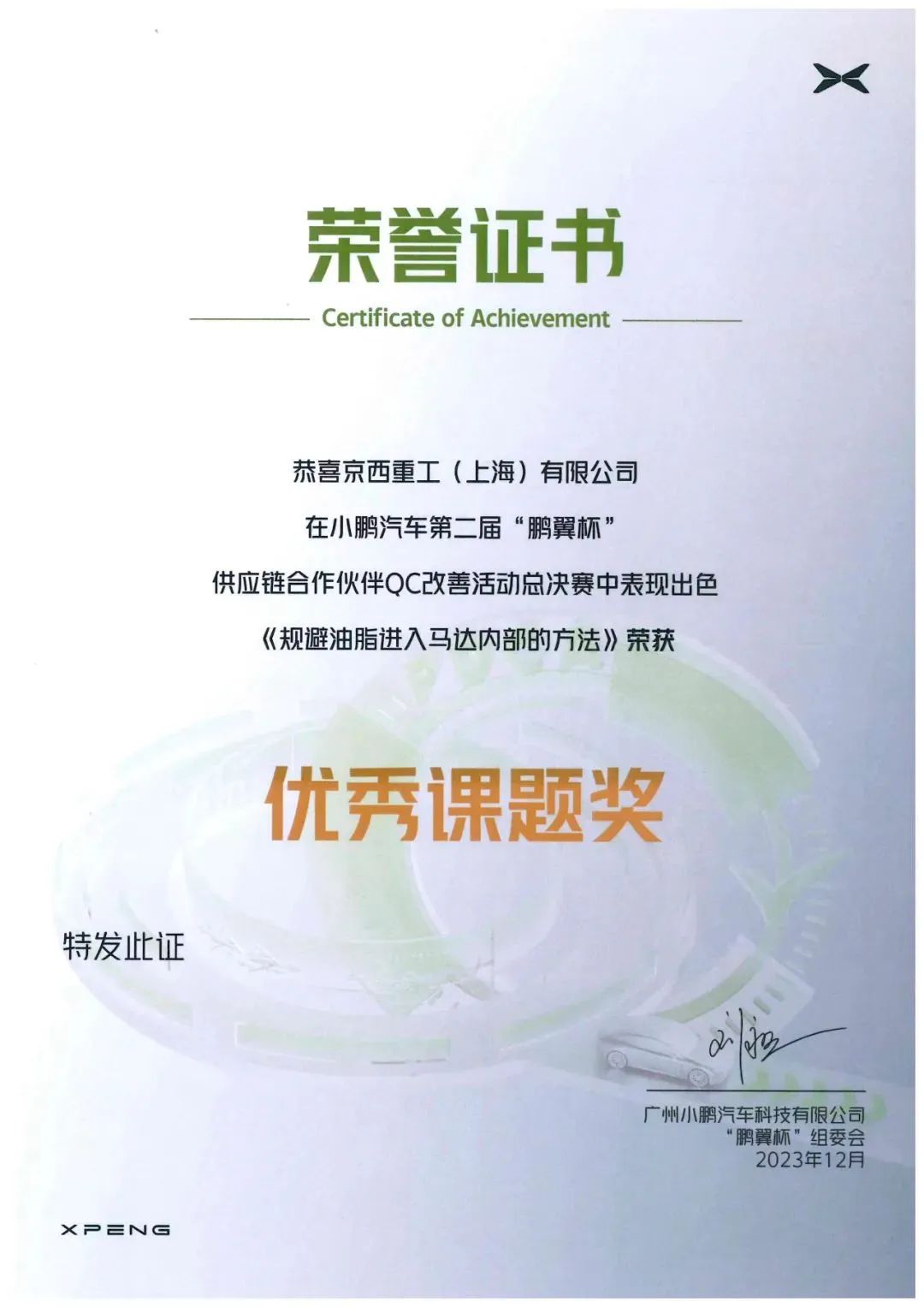 榮獲小鵬汽車第二屆“鵬翼杯”優(yōu)秀課題獎。憑借穩(wěn)定優(yōu)秀的品質(zhì)和研究項目《規(guī)避油脂進(jìn)入馬達(dá)內(nèi)部的方法》及其突出改善成果得到客戶高度認(rèn)可。