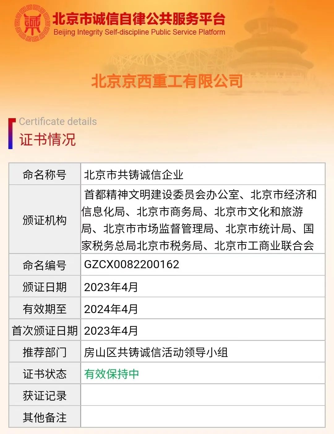 ?此次成功榮獲“北京市共鑄誠信企業(yè)”稱號,是對公司誠信經營和良好口碑的高度認可。以誠信為本,互信互助,賦能公司高質量發(fā)展。接下來,京西重工將繼續(xù)堅持誠信為本原則,不斷完善誠信管理制度,持續(xù)提高企業(yè)的誠信意識和信用管理水平,追求卓越、真誠合作、把關產品、奉獻社會。