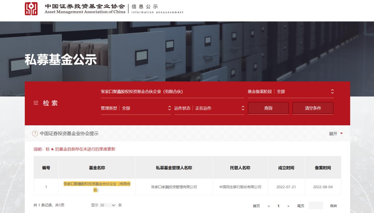 中國證券投資基金業(yè)協(xié)會可查登記備案信息張家口聚鑫股權(quán)投資基金合伙企業(yè)(有限合伙)