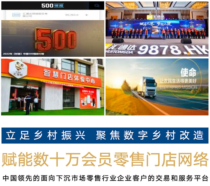 匯通達由原五星電器核心管理團隊創(chuàng)立,致力于鄉(xiāng)鎮(zhèn)市場的農村個體商店,構建起深達農村底層市場的經銷與服務網絡。2018年4月,阿里巴巴集團宣布向匯通達投資45億元,匯通達估值由105億元增長至225億人民幣,獲評“中國互聯(lián)網企業(yè)100強”、“全球獨角獸企業(yè)500強”和“中國民營企業(yè)500強”等榮譽稱號。