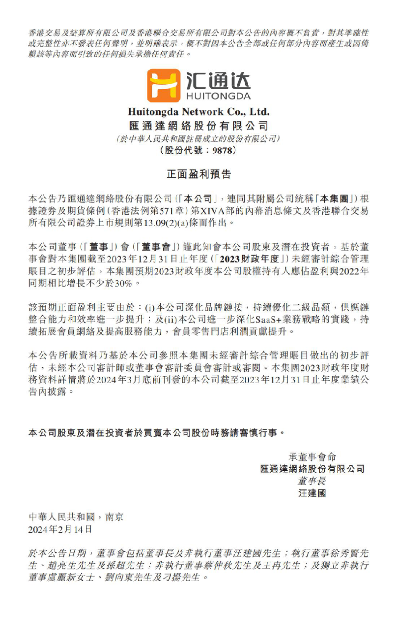 近日,張家口金融控股集團有限公司(簡稱:張家口金控)被投企業(yè)——“下沉市場第一股”匯通達網絡(09878.HK)(簡稱:匯通達)發(fā)布2023年正面盈利預告——截至2023年12月31日止年度(2023財政年度),未經審計綜合管理賬目之初步評估,股權持有人應占盈利與2022年同期相比增長不少于30%。