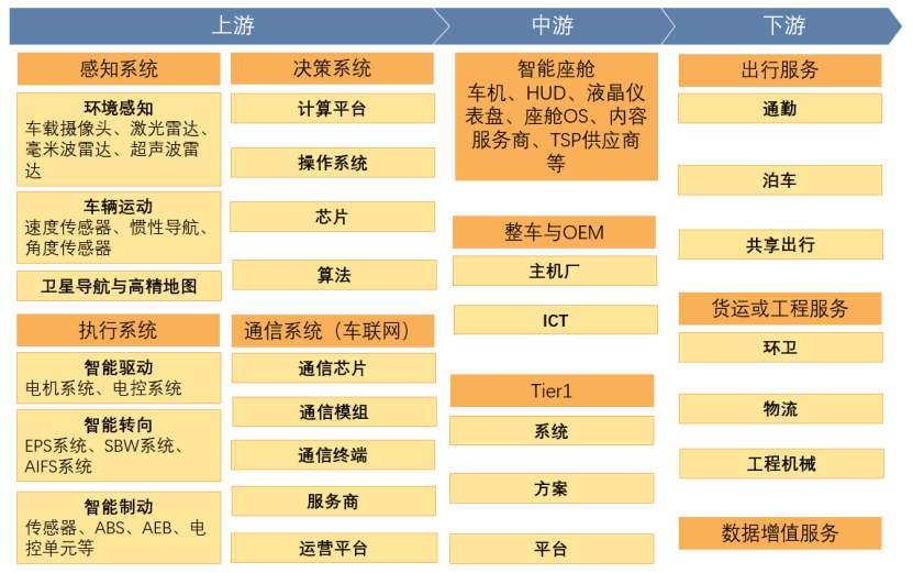 ?從產(chǎn)業(yè)鏈看,智能汽車產(chǎn)業(yè)鏈上游主要為感知系統(tǒng)、決策系統(tǒng)、執(zhí)行系統(tǒng)和通信系統(tǒng),中游包括智能座艙、整車廠與OEM(原始設(shè)備制造商,Original Equipment Manufacturer)、一級(jí)汽車供應(yīng)商(Tier1),下游包含出行服務(wù)、貨運(yùn)或工程服務(wù)和數(shù)據(jù)增值服務(wù)。