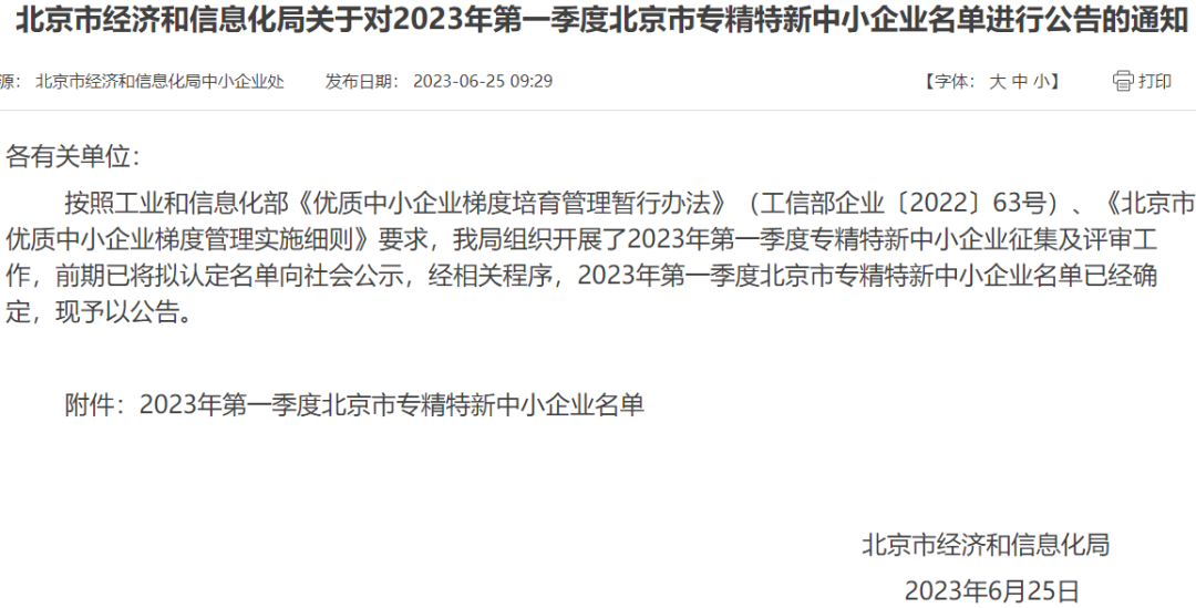 獲評北京市專精特新中小企業(yè)