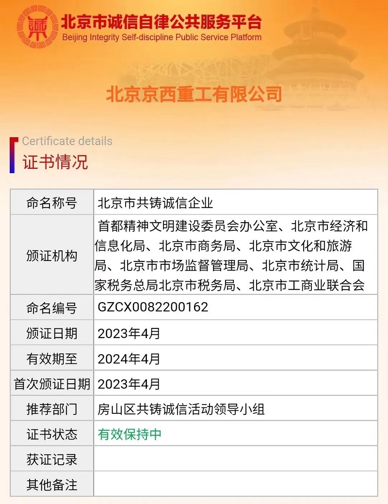 ?此次成功榮獲“北京市共鑄誠信企業(yè)”稱號,是對公司誠信經營和良好口碑的高度認可。以誠信為本,互信互助,賦能公司高質量發(fā)展。接下來,京西重工將繼續(xù)堅持誠信為本原則,不斷完善誠信管理制度,持續(xù)提高企業(yè)的誠信意識和信用管理水平,追求卓越、真誠合作、把關產品、奉獻社會。
